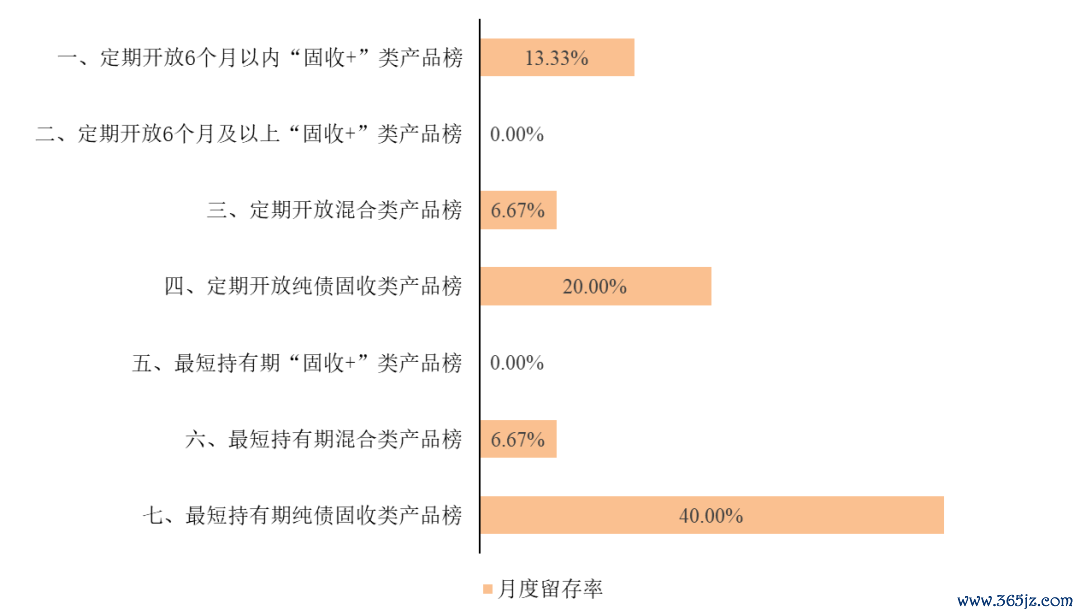 3月榜单的产品留存率均显著下降,仅9家机构的13只产品连续上榜,产品留存率为12.38%。动荡市场凸显固收类产品低风险低波动优势,纯债固收类榜单产品留存率显著高于“固收+”类与混合类。