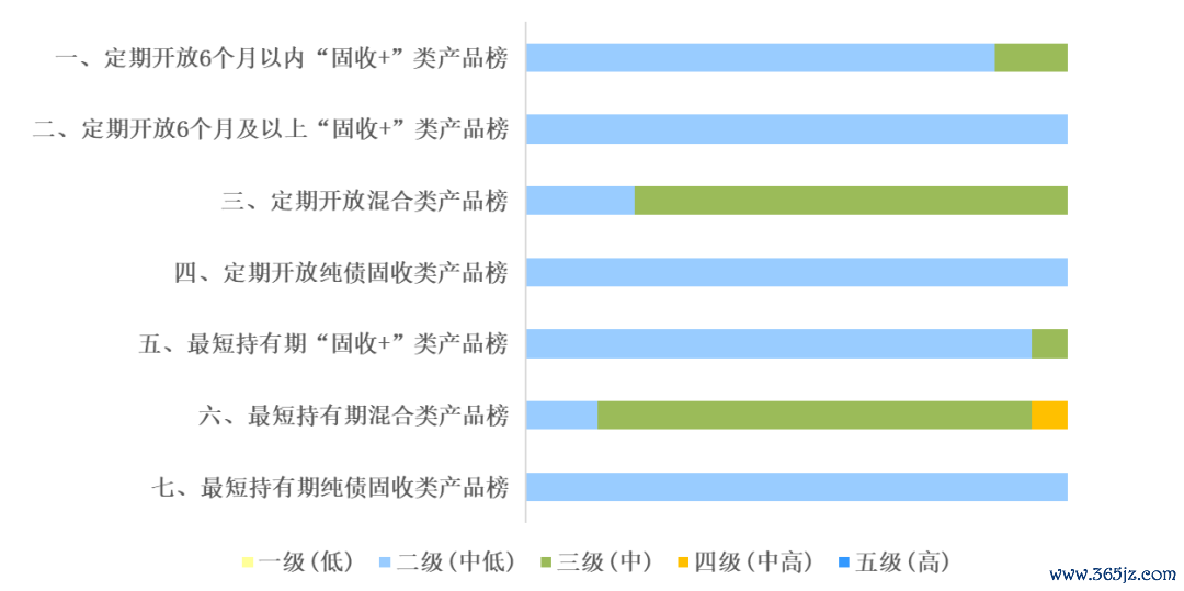 3月榜单整体风险水平向中低风险收敛。一方面,“同类不同级”现象较2月有所减弱,上榜纯债固收类产品风险水平均为二级(中低)风险。另一方面,“同级不同类”的现象仍然突出:“固收+”类上榜产品中,风险等级为二级(中低)风险的比例高达93.33%;上榜的混合类产品中,二级(中低)风险产品数量甚至超过四级(中高)风险产品数量。